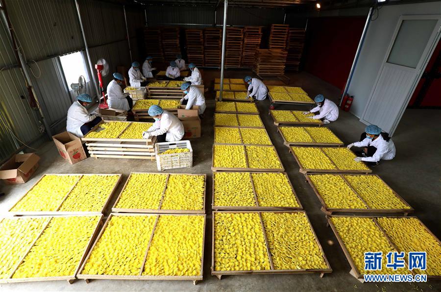 9月28日,在石家庄市行唐县南桥镇沙河水乡现代农业园区,农户在精选皇菊花。 新华社发(梁子栋 摄)