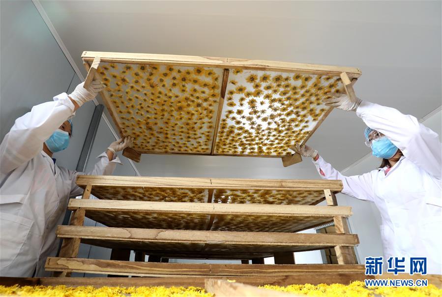 9月28日,在石家庄市行唐县南桥镇沙河水乡现代农业园区,农户在晾晒皇菊花。 新华社发(梁子栋 摄)