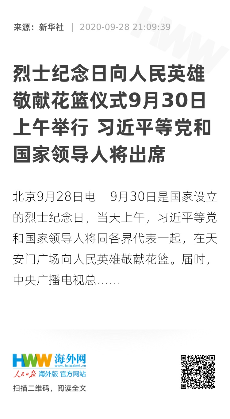 新华社北京9月28日电 9月30日是国家设立的烈士纪念日,当天上午,习近平等党和国家领导人将同各界代表一起,在天安门广场向人民英雄敬献花篮。
