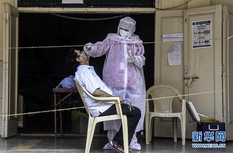 9月28日,一名工作人员在印度孟买一处新冠隔离中心为一名男子进行取样检测。 印度卫生部28日上午公布的数据显示,过去24小时印度新增新冠确诊病例82170例,累计确诊突破600万例,达6074702例,新增死亡1039例,累计死亡95542例。 新华社发