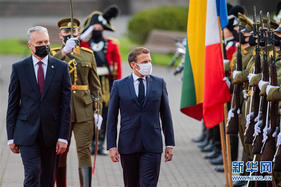 9月28日,在立陶宛维尔纽斯,立陶宛总统瑙塞达(左)和法国总统马克龙检阅仪仗队。 正在立陶宛访问的法国总统马克龙28日表示,要想确保欧洲的和平,必须与俄罗斯展开合作,法国支持与俄罗斯展开透明对话。 新华社发(阿尔弗雷达斯·普里亚迪斯 摄)