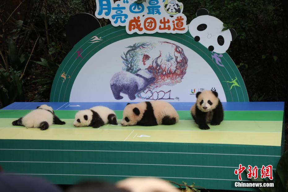 亮相的大熊猫幼仔分别为太阳产房的“三巨头”——“热干面”“蛋烘糕”和“春生”以及诞生于月亮产房的“四最”——“润玥”“艾玖”“和花”“和叶”。