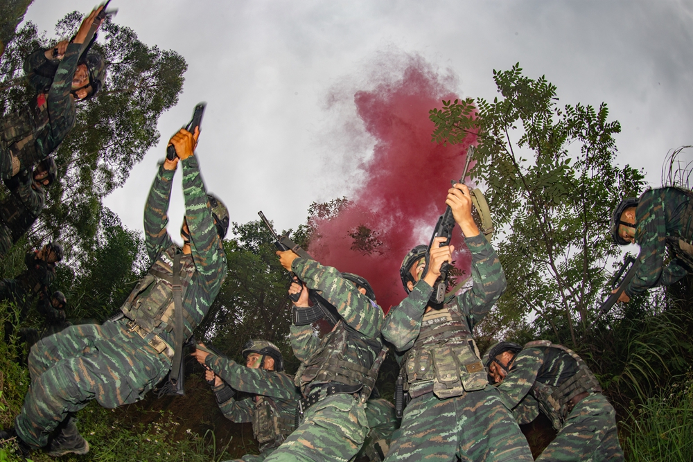 9月27日,武警广西总队来宾支队组织特战队员在野外陌生地域开展武装奔袭、小组战术、极限体能等课目的训练,全面锤炼特战队员在复杂条件下的综合实战能力。(摄影:余海洋)