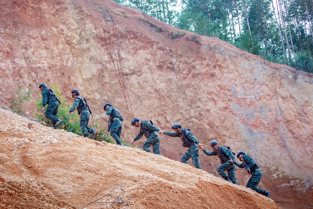 9月27日,武警广西总队来宾支队组织特战队员在野外陌生地域开展武装奔袭、小组战术、极限体能等课目的训练,全面锤炼特战队员在复杂条件下的综合实战能力。(摄影:余海洋)