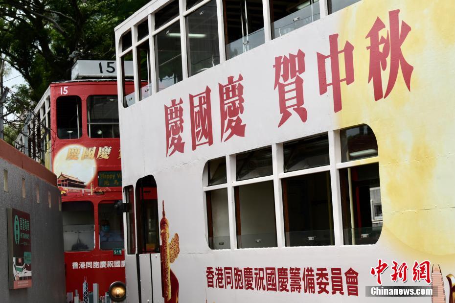 9月29日,国庆节即将到来,香港同胞庆祝国庆筹备委员会举行“庆国庆 贺中秋”香港岛电车巡游活动,多辆电车车身喷上庆祝标语广告,于港岛东西行走庆祝。 中新社记者 李志华 摄