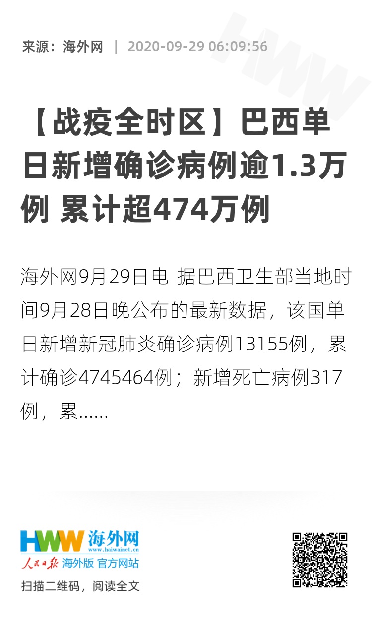 海外网9月29日电 据巴西卫生部当地时间9月28日晚公布的最新数据,该国单日新增新冠肺炎确诊病例13155例,累计确诊4745464例;新增死亡病例317例,累计死亡病例142058例。目前,巴西确诊病例和死亡病例仍居全球第二,仅次于美国。