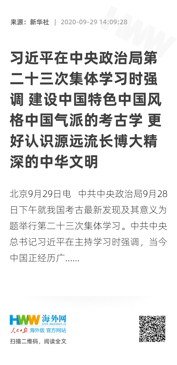 新华社北京9月29日电 中共中央政治局9月28日下午就我国考古最新发现及其意义为题举行第二十三次集体学习。中共中央总书记习近平在主持学习时强调,当今中国正经历广泛而深刻的社会变革,也正进行着坚持和发展中国特色社会主义的伟大实践创新。我们的实践创新必须建立在历史发展规律之上,必须行进在历史正确方向之上。要高度重视考古工作,努力建设中国特色、中国风格、中国气派的考古学,更好认识源远流长、博大精深的中华文明,为弘扬中华优秀传统文化、增强文化自信提供坚强支撑。