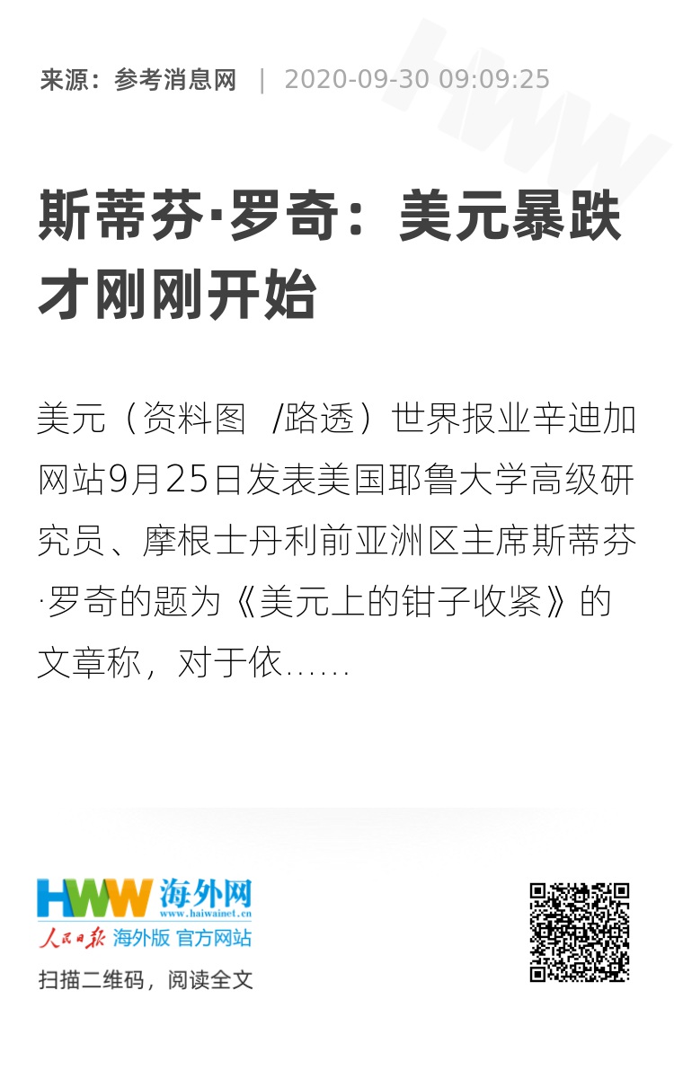 世界报业辛迪加网站9月25日发表美国耶鲁大学高级研究员、摩根士丹利前亚洲区主席斯蒂芬·罗奇的题为《美元上的钳子收紧》的文章称,对于依然定值过高的美元来说,美元的下跌刚刚开始。文章内容编译如下: