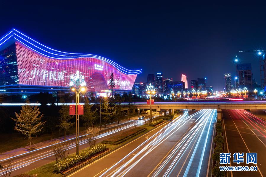 9月29日拍摄的成都市环球中心灯光秀。 据成都市城市管理委员会消息,9月29日至10月10日每晚7点半开始,成都市天府广场、锦江公园、金融城双塔、环球中心等城市地标建筑上演国庆、中秋主题灯光秀和投影秀。 新华社发(张可凡 摄)