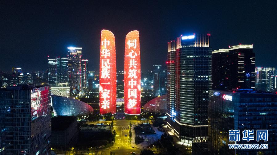 9月29日拍摄的成都市金融城双塔灯光秀(无人机照片)。 据成都市城市管理委员会消息,9月29日至10月10日每晚7点半开始,成都市天府广场、锦江公园、金融城双塔、环球中心等城市地标建筑上演国庆、中秋主题灯光秀和投影秀。 新华社发(张可凡 摄)