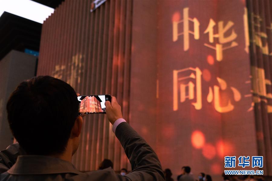 9月29日,一名市民用手机拍摄四川省图书馆灯光秀。 据成都市城市管理委员会消息,9月29日至10月10日每晚7点半开始,成都市天府广场、锦江公园、金融城双塔、环球中心等城市地标建筑上演国庆、中秋主题灯光秀和投影秀。 新华社发(张可凡 摄)