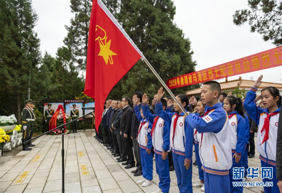 9月30日,云南省曲靖市马龙区在当地的马龙区烈士陵园举行公祭烈士活动,这是参加公祭活动的小学生在唱中国少年先锋队队歌。新华社发(陈欣波摄)
