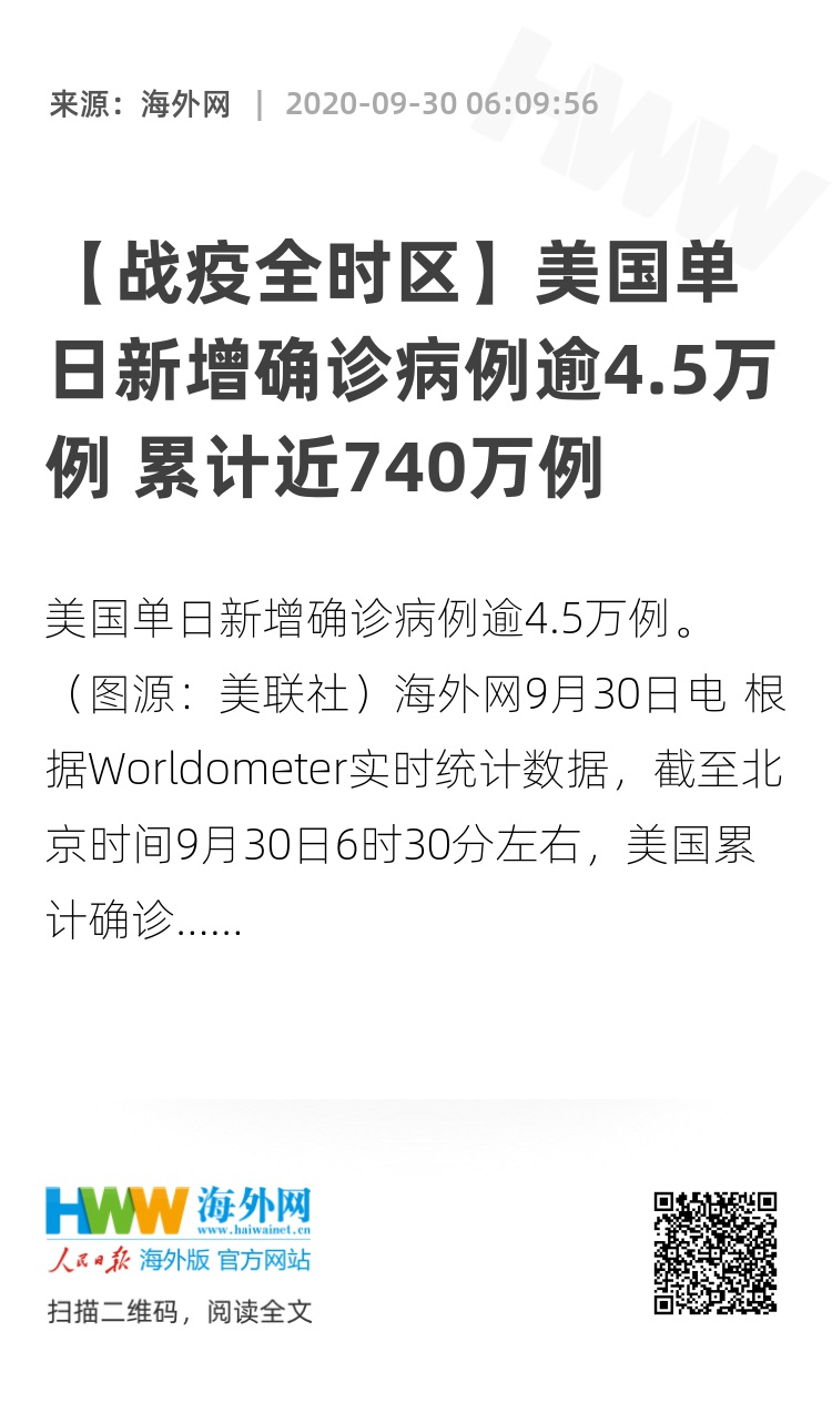 海外网9月30日电 根据Worldometer实时统计数据,截至北京时间9月30日6时30分左右,美国累计确诊新冠肺炎病例7395971例,累计死亡210620例。与前一日6时30分数据相比,美国新增确诊病例45545例,新增死亡病例904例。