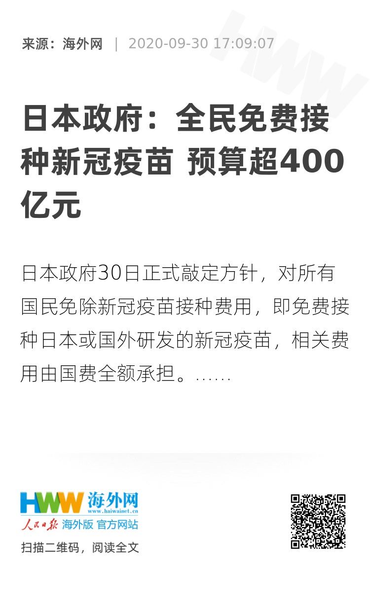 海外网9月30日电 日本政府30日正式敲定方针,对所有国民免除新冠疫苗接种费用,即免费接种日本或国外研发的新冠疫苗,相关费用由国费全额承担。