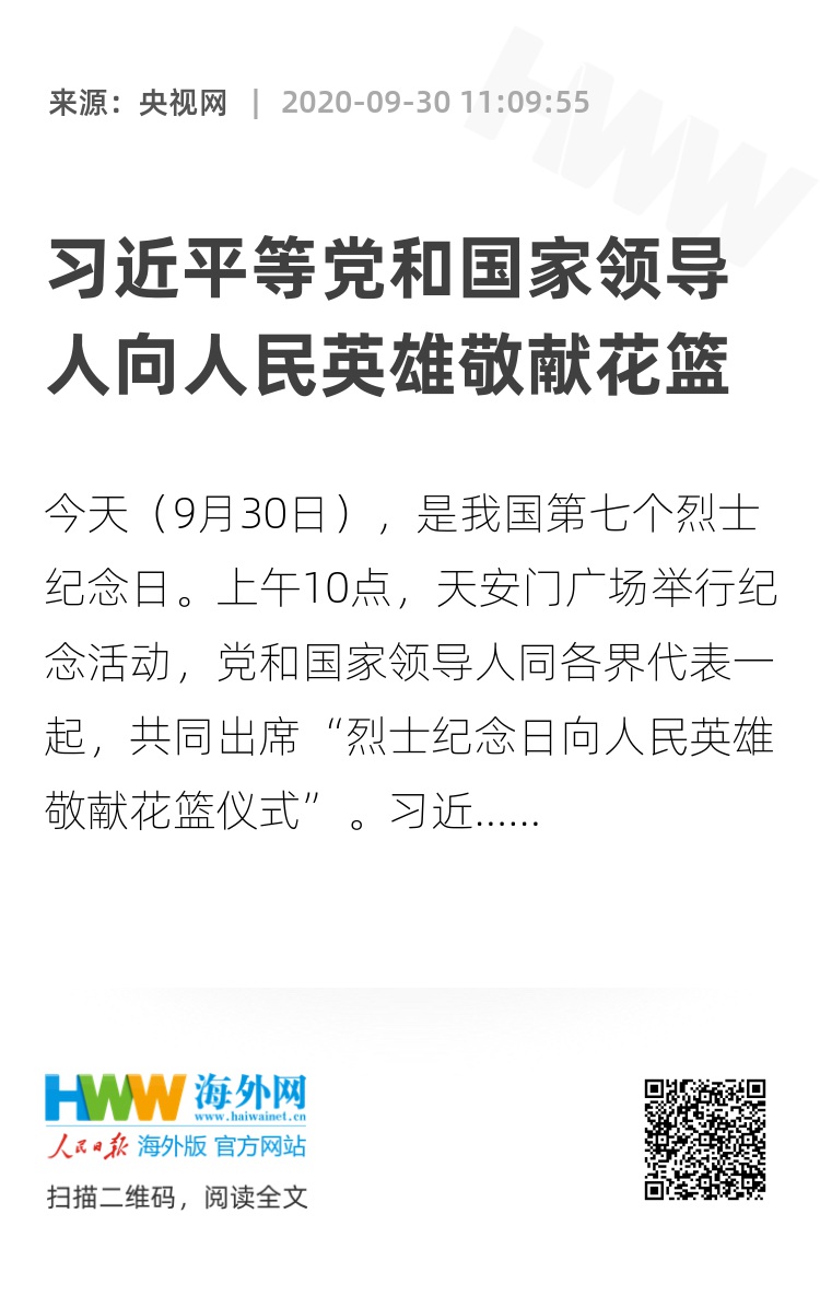 今天(9月30日),是我国第七个烈士纪念日。上午10点,天安门广场举行纪念活动,党和国家领导人同各界代表一起,共同出席“烈士纪念日向人民英雄敬献花篮仪式”。