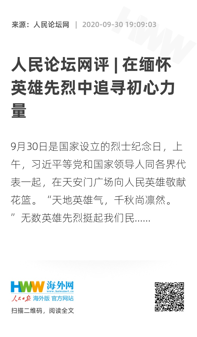 9月30日是国家设立的烈士纪念日,上午,习近平等党和国家领导人同各界代表一起,在天安门广场向人民英雄敬献花篮。“天地英雄气,千秋尚凛然。”无数英雄先烈挺起我们民族的脊梁,是我们不断开拓前进的勇气和力量源泉。今天,我们致敬英雄先烈,忠魂永不朽。