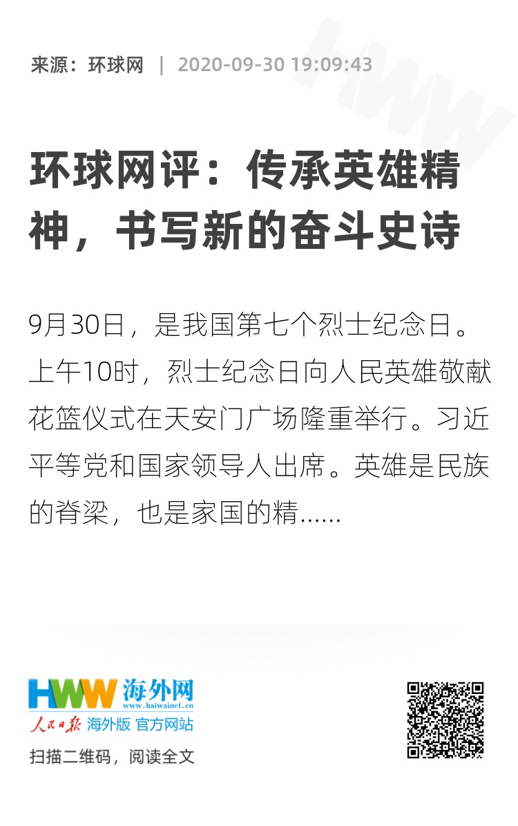 “实现我们的目标,需要英雄,需要英雄精神。”不管时代怎样变迁,无论环境如何改变,尊敬英雄也都是一种价值观的传承。今年是具有里程碑意义的一年,我们将全面建成小康社会,实现第一个百年奋斗目标。国家高规格纪念烈士,也鞭策着我们要拧紧世界观、人生观、价值观这个“总开关”,凝聚追梦强大力量,书写新的奋斗史诗,在新时代的长征路上创造更多的发展奇迹。(寰平)