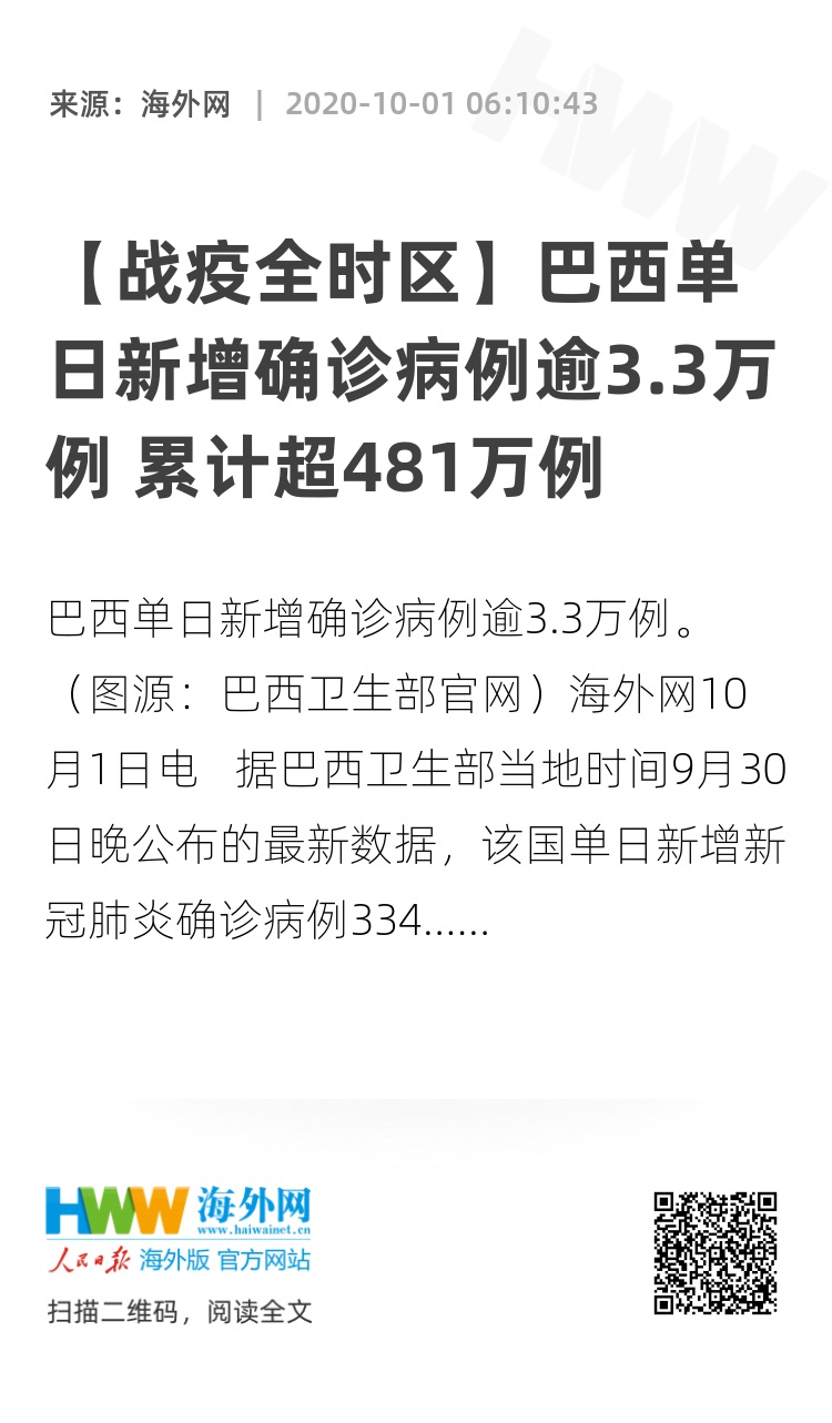海外网10月1日电 据巴西卫生部当地时间9月30日晚公布的最新数据,该国单日新增新冠肺炎确诊病例33413例,累计确诊4810935例;新增死亡病例1031例,累计死亡病例143952例。巴西确诊病例目前依然居全球第三,仅次于美国和印度。