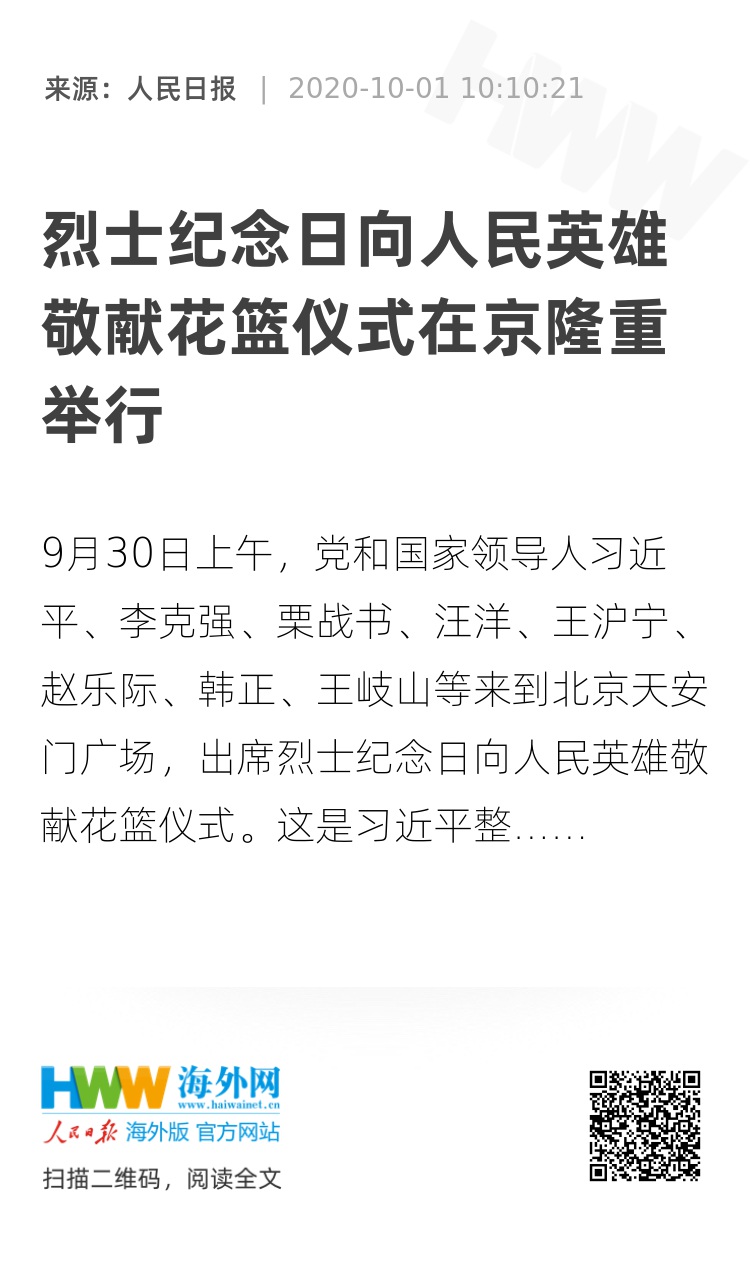 9月30日上午,党和国家领导人习近平、李克强、栗战书、汪洋、王沪宁、赵乐际、韩正、王岐山等来到北京天安门广场,出席烈士纪念日向人民英雄敬献花篮仪式。 新华社记者 谢环驰摄