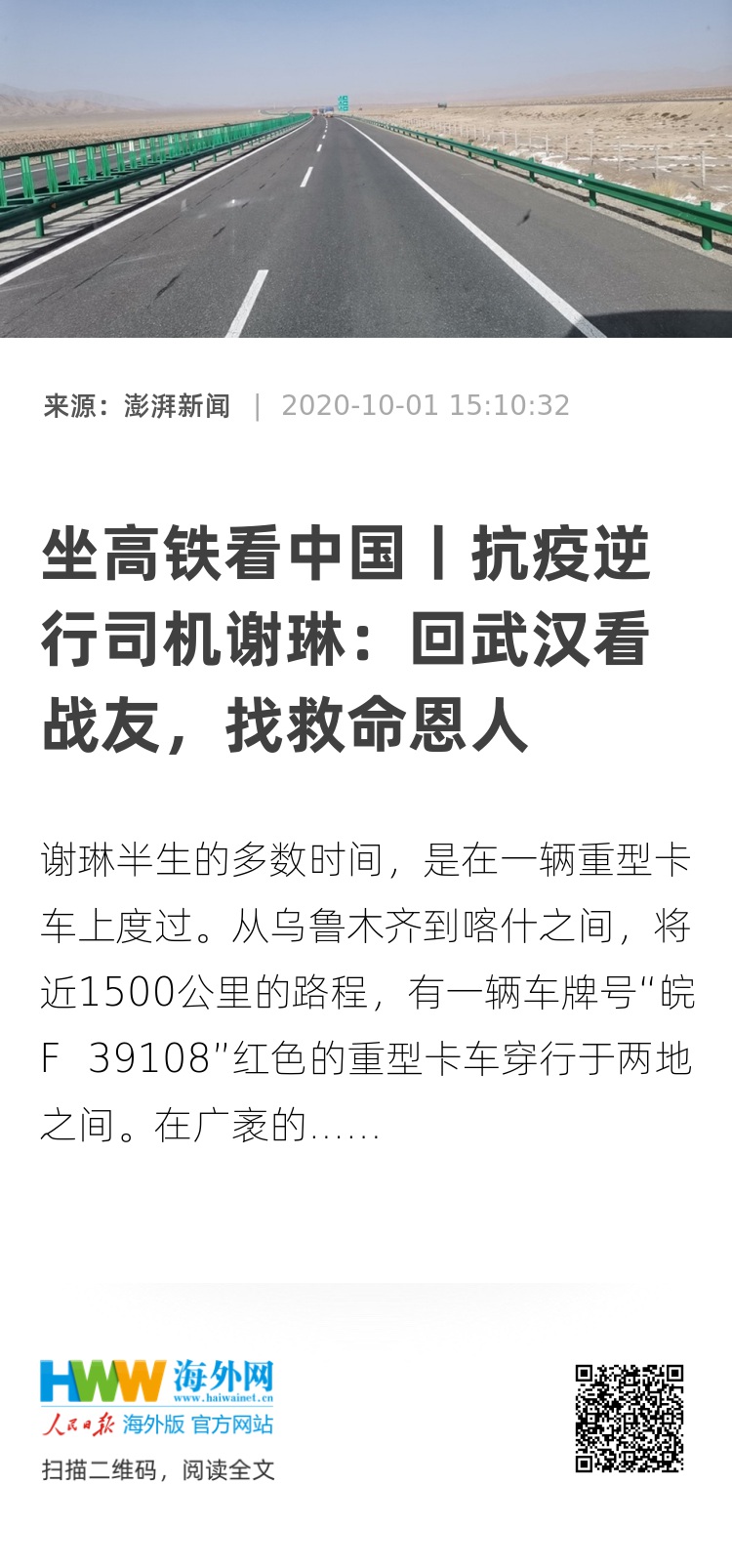 10月1日,澎湃新闻将直播跟随谢琳搭乘高铁重返武汉,去看看那座英雄城市,去看看那些曾经被困在疫情的寒冬但幸运走出来的人。