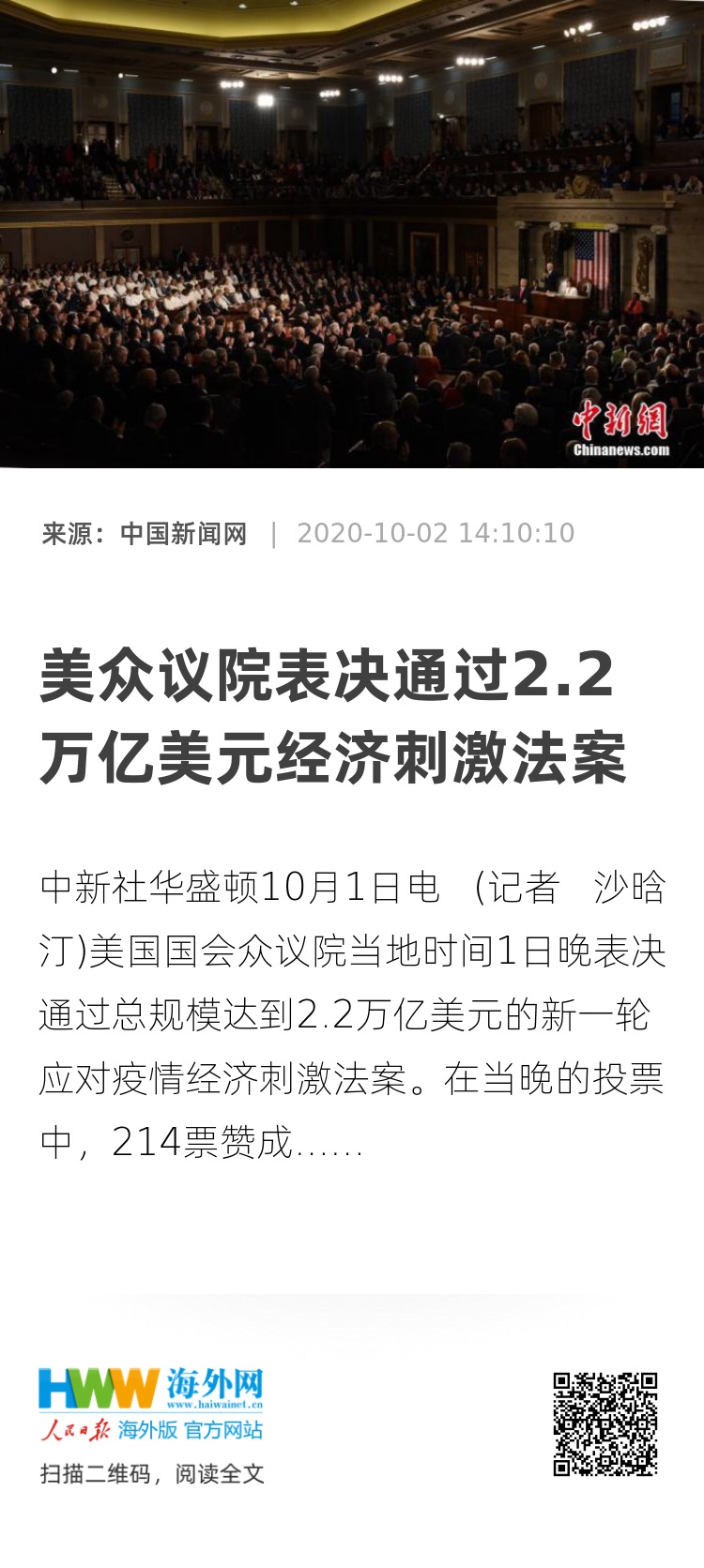 中新社华盛顿10月1日电 (记者 沙晗汀)美国国会众议院当地时间1日晚表决通过总规模达到2.2万亿美元的新一轮应对疫情经济刺激法案。
