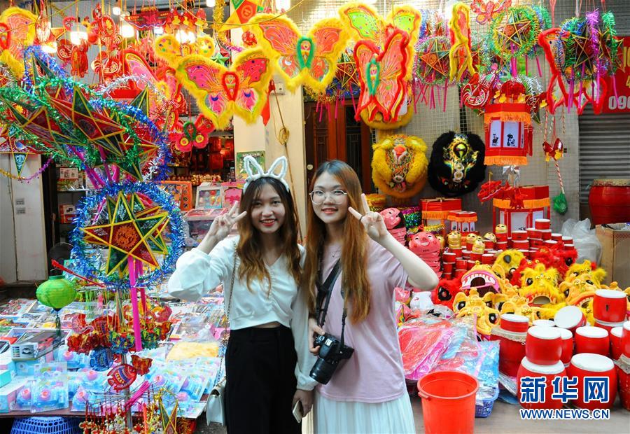 10月1日,女青年在越南首都河内古街区出售节日装饰礼品的商铺前留影。 农历八月十五是越南中秋节,也是当地儿童和青年们的节日。依照习俗,人们会给孩子们赠送各种玩具、饰品和零食。今年节日期间,河内古街区热闹非凡,各式礼品装饰品摊位吸引市民前来休闲、购物。 新华社记者 陶军 摄