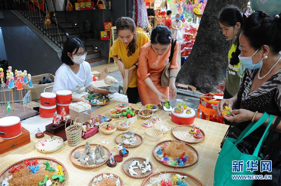 10月1日,人们在越南首都河内古街区挑选传统的儿童玩具。 农历八月十五是越南中秋节,也是当地儿童和青年们的节日。依照习俗,人们会给孩子们赠送各种玩具、饰品和零食。今年节日期间,河内古街区热闹非凡,各式礼品装饰品摊位吸引市民前来休闲、购物。 新华社记者 陶军 摄