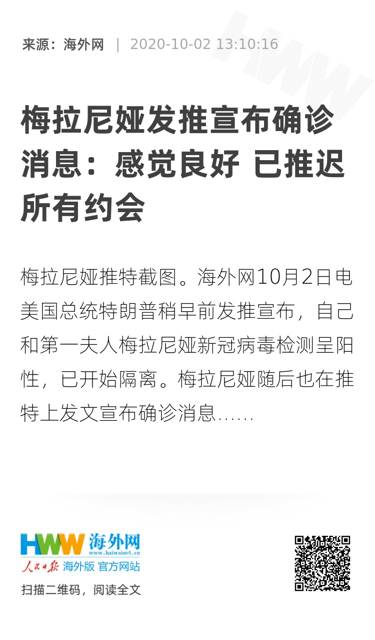 海外网10月2日电 美国总统特朗普稍早前发推宣布,自己和第一夫人梅拉尼娅新冠病毒检测呈阳性,已开始隔离。梅拉尼娅随后也在推特上发文宣布确诊消息。