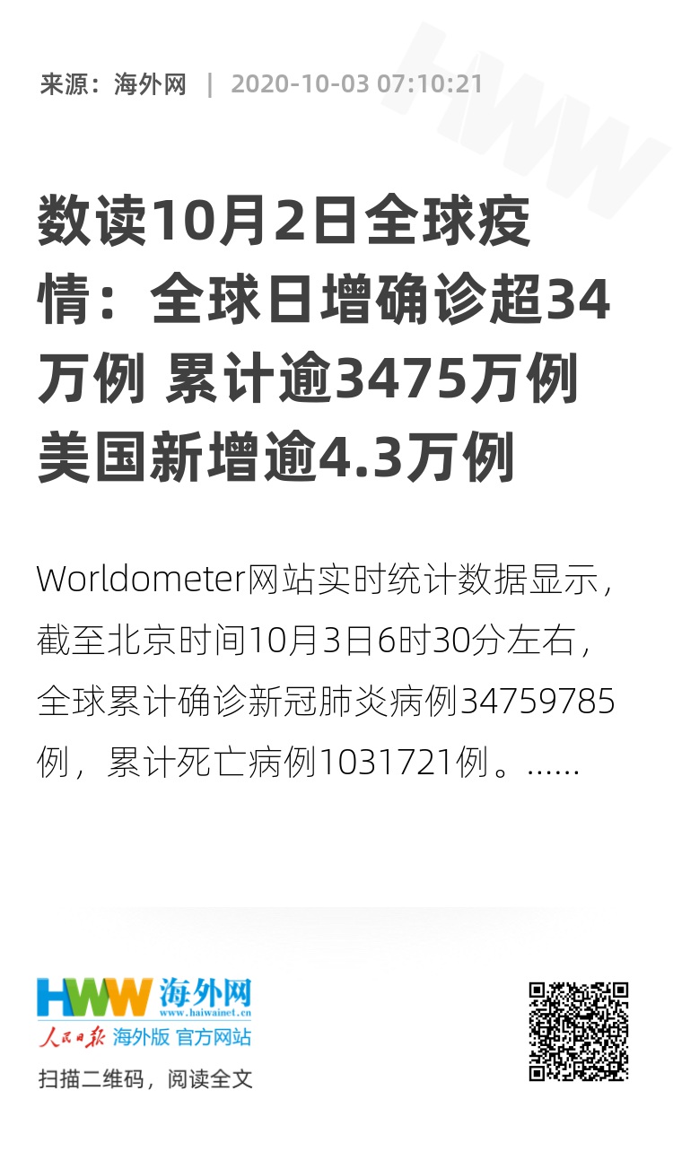 海外网10月3日电 Worldometer网站实时统计数据显示,截至北京时间10月3日6时30分左右,全球累计确诊新冠肺炎病例34759785例,累计死亡病例1031721例。与前一日相比,全球单日新增确诊病例347066例,新增死亡病例8888例。中国以外新增确诊病例逾34.7万例,累计确诊病例逾3467万例,累计死亡病例逾102.7万例。