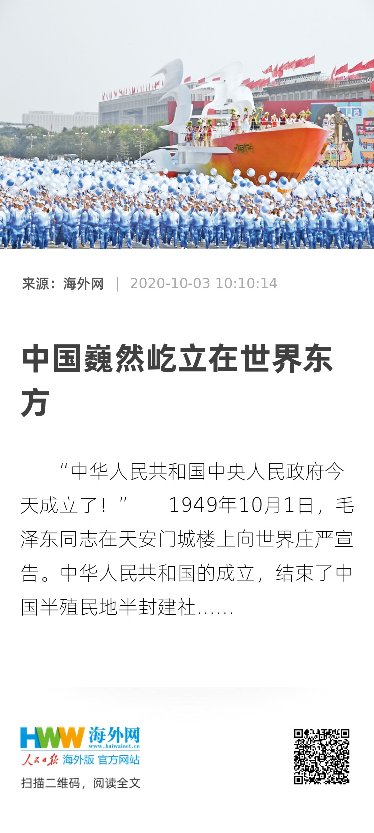 1949年10月1日,毛泽东同志在天安门城楼上向世界庄严宣告。中华人民共和国的成立,结束了中国半殖民地半封建社会的历史,彻底改变了近代以后100多年中国积贫积弱、受人欺凌的悲惨命运,中国人民从此站起来了,中华民族从此走上了实现伟大复兴的壮阔征程。