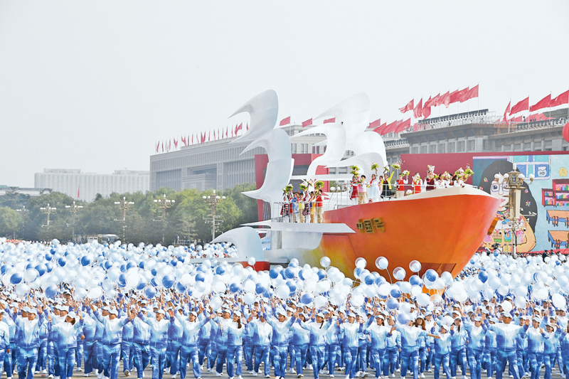 2019年10月1日上午,庆祝中华人民共和国成立70周年大会在北京天安门广场隆重举行。这是群众游行中的“扬帆远航”方阵。新华社记者 李欣/摄