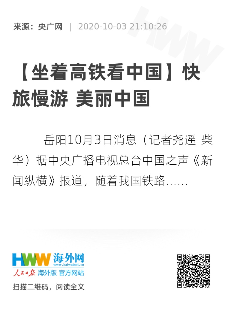 才饮珠江水,又赏洞庭月。武广高铁的开通,拉近了湖北、湖南和广东三省的时空距离,成为串起珠三角、长株潭、武汉城市圈三大城市群的“黄金旅游线”。中国之声系列报道《坐着高铁看中国》,10月3日推出:《快旅慢游 美丽中国》。