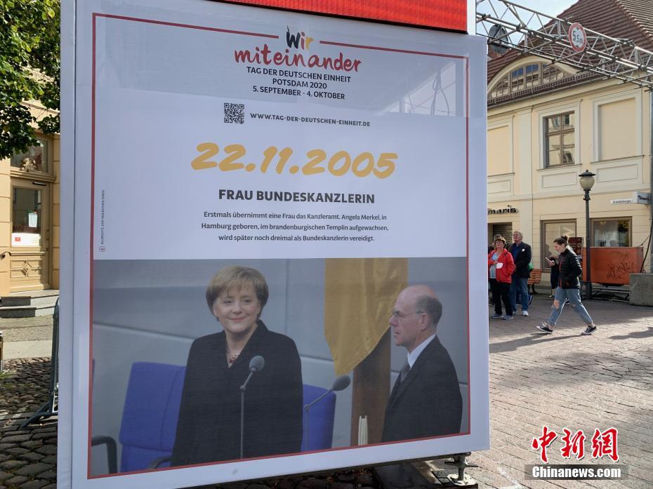 当地时间10月3日,纪念德国统一30周年大型展览在德国波茨坦举行。图为当天展览选出的统一30年重大历史事件中,2005年入选的事件是德国选出首位女性总理——默克尔。 中新社记者 彭大伟 摄