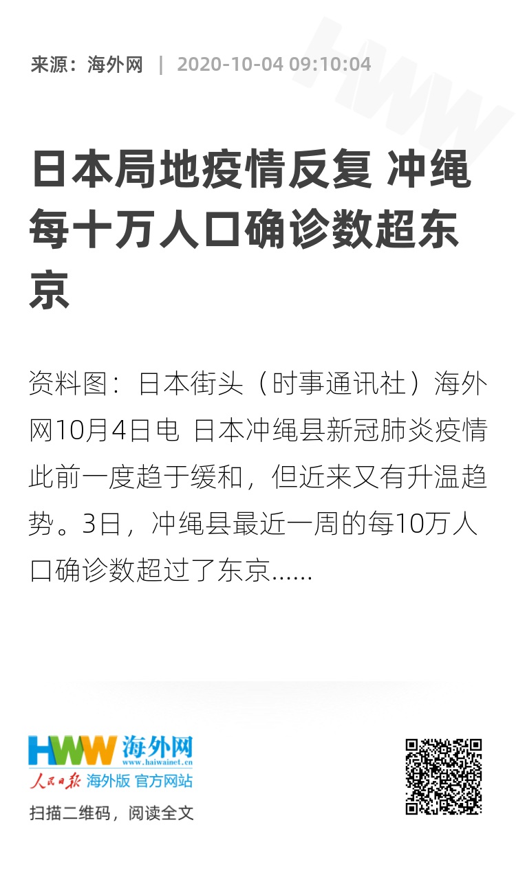 海外网10月4日电 日本冲绳县新冠肺炎疫情此前一度趋于缓和,但近来又有升温趋势。3日,冲绳县最近一周的每10万人口确诊数超过了东京,位居日本全国之首。