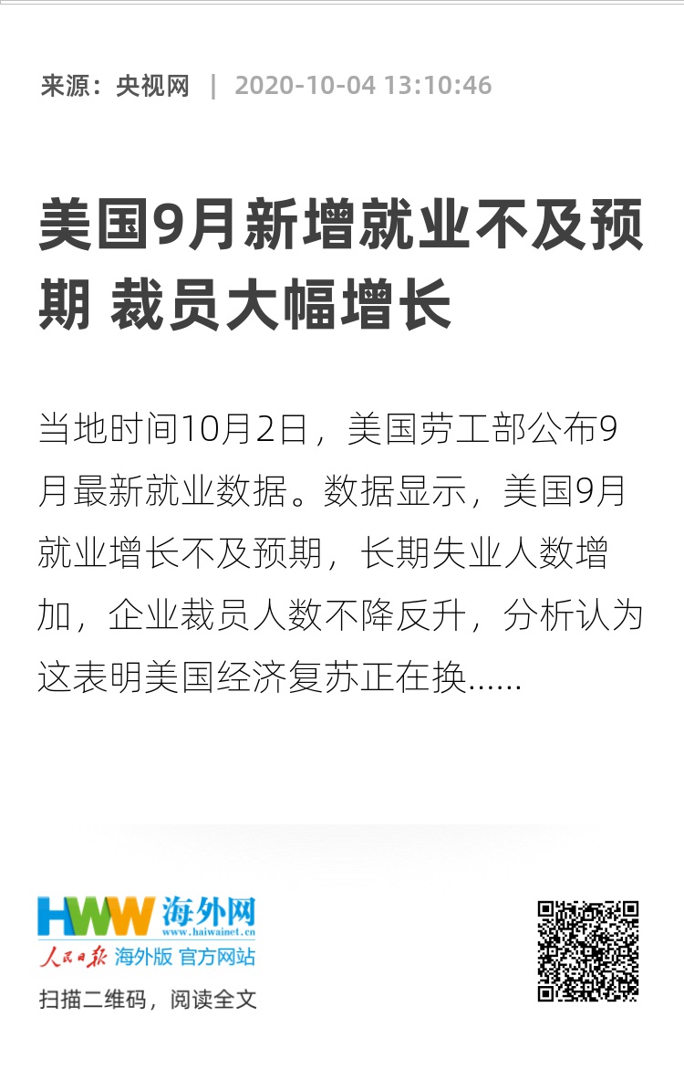当地时间10月2日,美国劳工部公布9月最新就业数据。数据显示,美国9月就业增长不及预期,长期失业人数增加,企业裁员人数不降反升,分析认为这表明美国经济复苏正在换入低速档,劳动力市场前景不容乐观。