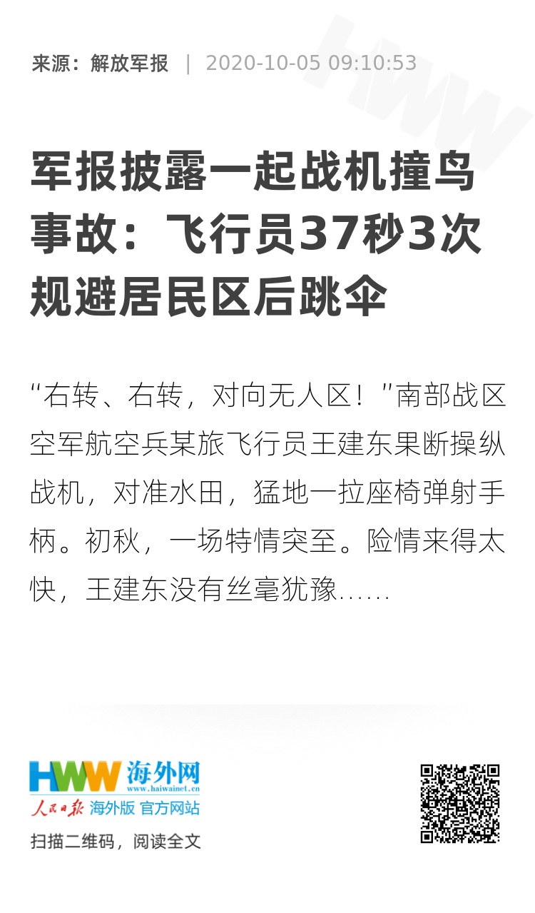 后续调查确认,事故系战机在起飞上升过程中,发动机遭鸟撞击导致空中停车。专家综合评估认为,王建东在37秒内3次规避居民区,一系列冷静准确的临机处置将地面伤害降到最低,没有造成人员伤亡。