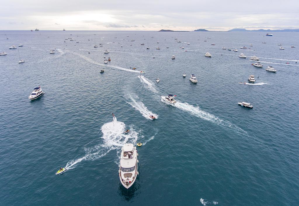 2020年10月3日,航拍百余艘游艇帆船在三亚附近海域游玩。当日是“十一”黄金周假期第三天,大批游客来到三亚游艇旅游中心,乘坐游艇帆船出海体验海洋魅力。
