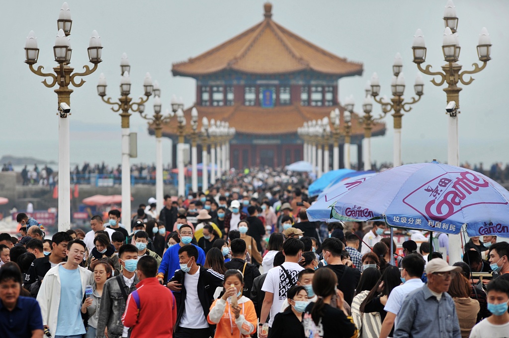 2020年10月2日,山东省青岛市栈桥景区回澜阁人头攒动,挤满观光度假的游客。