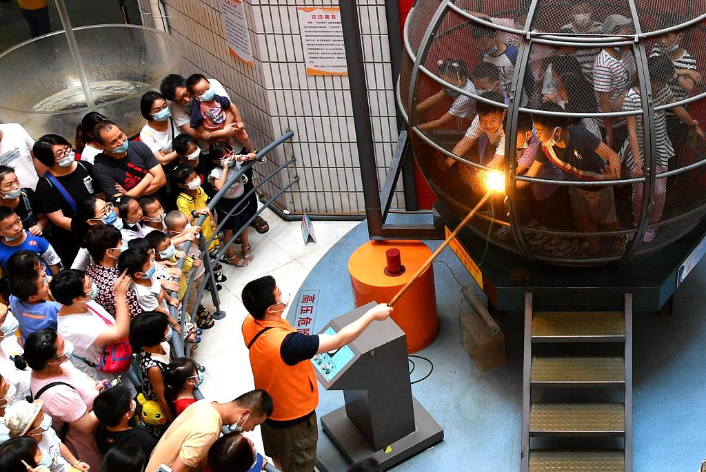 2020年10月4日,在福建省科技馆,小朋友体验法拉第笼。国庆假期,在福建省福州市,一些市民和游客来到福建省科技馆,近距离感受科学的魅力。 吕明(福建分社)/中新社