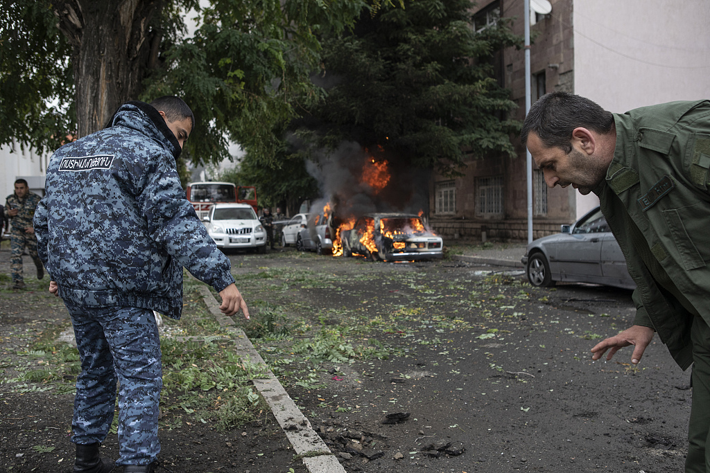 当地时间2020年10月4日,纳卡地区斯捷潘纳克特,亚美尼亚与阿塞拜疆在纳戈尔诺-卡拉巴赫(纳卡)地区军事冲突进入第八天,民众拿着东西避难。当天双方发生激烈交火,战事逐渐白热化,迄今造成至少240人死亡,当地平民受到波及。图片作者:人民视觉