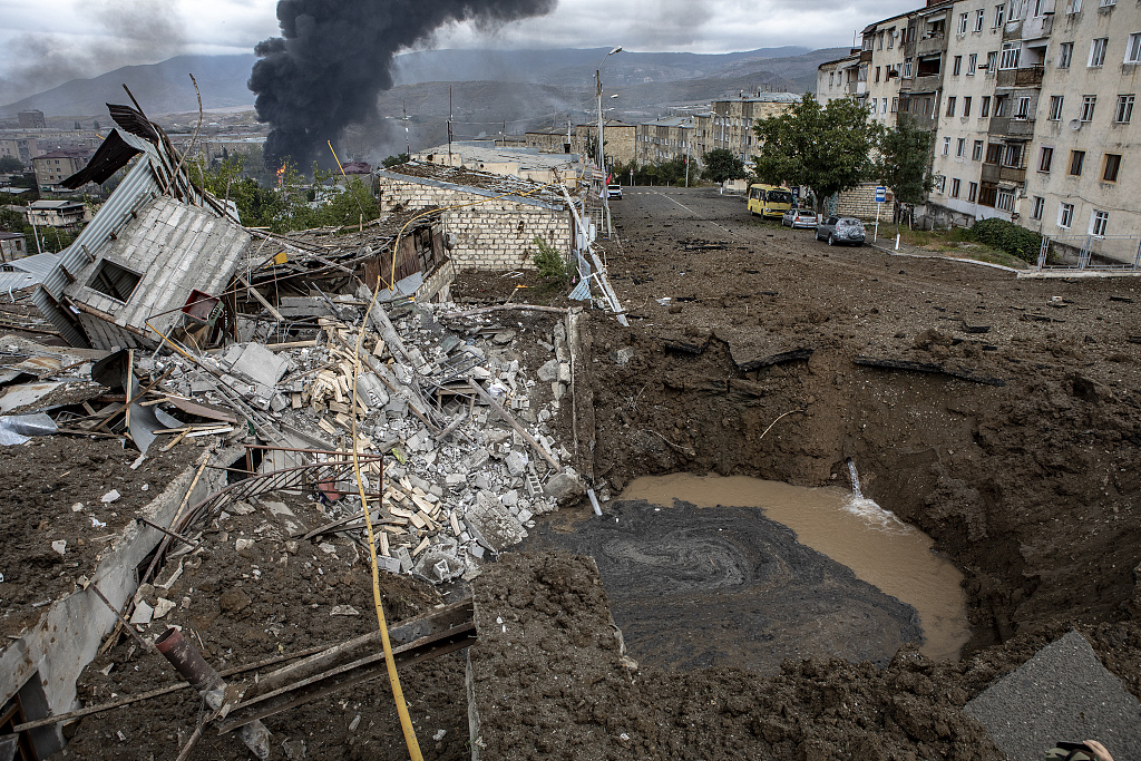 当地时间2020年10月4日,纳卡地区斯捷潘纳克特,亚美尼亚与阿塞拜疆在纳戈尔诺-卡拉巴赫(纳卡)地区军事冲突进入第八天,民众拿着东西避难。当天双方发生激烈交火,战事逐渐白热化,迄今造成至少240人死亡,当地平民受到波及。图片作者:人民视觉