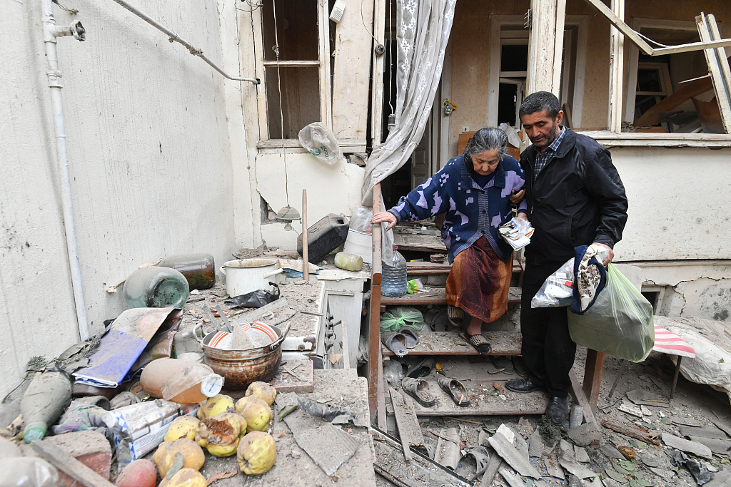 当地时间2020年10月4日,纳卡地区斯捷潘纳克特,亚美尼亚与阿塞拜疆在纳戈尔诺-卡拉巴赫(纳卡)地区军事冲突进入第八天,民众拿着东西避难。当天双方发生激烈交火,战事逐渐白热化,迄今造成至少240人死亡,当地平民受到波及。图片作者:人民视觉