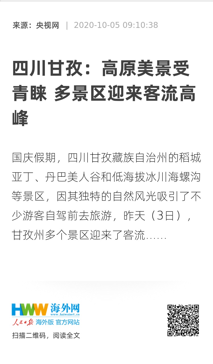 国庆假期,四川甘孜藏族自治州的稻城亚丁、丹巴美人谷和低海拔冰川海螺沟等景区,因其独特的自然风光吸引了不少游客自驾前去旅游,昨天(3日),甘孜州多个景区迎来了客流高峰。