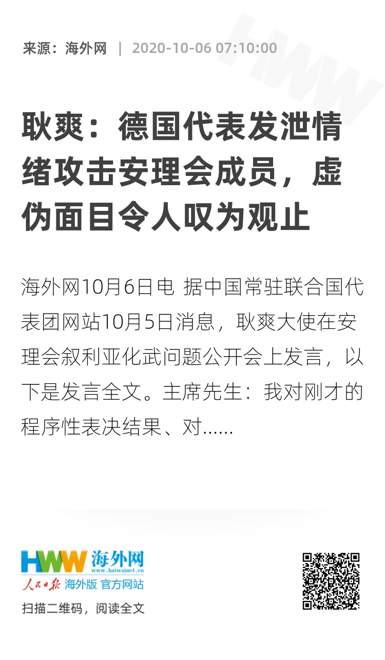 海外网10月6日电 据中国常驻联合国代表团网站10月5日消息,耿爽大使在安理会叙利亚化武问题公开会上发言,以下是发言全文。