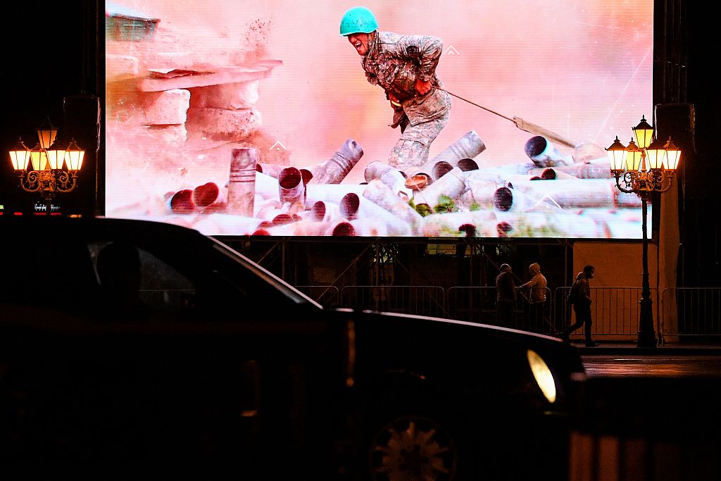 当地时间2020年10月5日,亚美尼亚埃尔温街头大屏幕播放爱国影片。当日,亚美尼亚与阿塞拜疆在纳戈尔诺-卡拉巴赫(纳卡)地区的军事冲突进入第9天,造成数百人死伤。国际社会进一步推动局势降级,俄罗斯外长拉夫罗夫、法国外长勒德里昂、美国国务卿蓬佩奥再度呼吁冲突双方立即和无条件地实施停火。图片作者:人民视觉