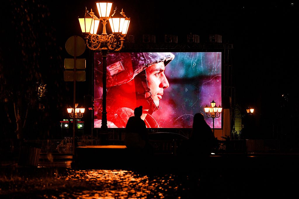 当地时间2020年10月5日,亚美尼亚埃尔温街头大屏幕播放爱国影片。当日,亚美尼亚与阿塞拜疆在纳戈尔诺-卡拉巴赫(纳卡)地区的军事冲突进入第9天,造成数百人死伤。国际社会进一步推动局势降级,俄罗斯外长拉夫罗夫、法国外长勒德里昂、美国国务卿蓬佩奥再度呼吁冲突双方立即和无条件地实施停火。图片作者:人民视觉