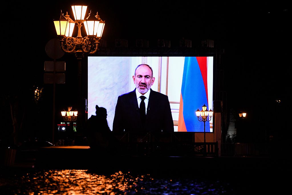 当地时间2020年10月5日,亚美尼亚埃尔温街头大屏幕播放亚美尼亚总理帕希尼扬讲话视频。当日,亚美尼亚与阿塞拜疆在纳戈尔诺-卡拉巴赫(纳卡)地区的军事冲突进入第9天,造成数百人死伤。国际社会进一步推动局势降级,俄罗斯外长拉夫罗夫、法国外长勒德里昂、美国国务卿蓬佩奥再度呼吁冲突双方立即和无条件地实施停火。