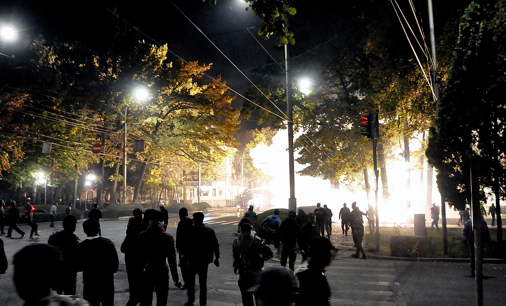 当地时间2020年10月6日凌晨,吉尔吉斯斯坦反对派支持者占领了位于首都比什凯克、集总统府和议会办公地点为一体的政府大楼“白宫”。据卫星新闻网报道,5日晚间,吉警务部门采取强力手段驱散了由11个反对派政党支持者组成的抗议人群,局势一度平静。午夜时分,局势再度紧张。抗议者重新集结并向警察投掷石块和燃烧瓶,焚烧多辆警车。与此同时,已获得足够票数可顺利进入议会的团结党领导人表示同意重新举行选举,并呼吁其他得票率超过7%的党派加入这一行列。图为警察执法人员在现场。与此同时,已获得足够票数可顺利进入议会的团结党领导人表示同意重新举行选举,并呼吁其他得票率超过7%的党派加入这一行列。图片作者:人民视觉