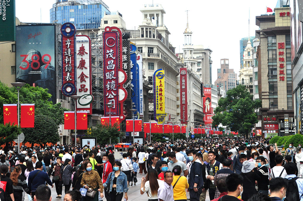 2020年10月6日,国庆长假第六天,上海南京路商业步行街人头攒动,众多游客在步行街上观光游览。