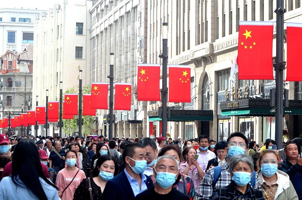 2020年10月6日,国庆长假第六天,上海南京路商业步行街人头攒动,众多游客在步行街上观光游览。